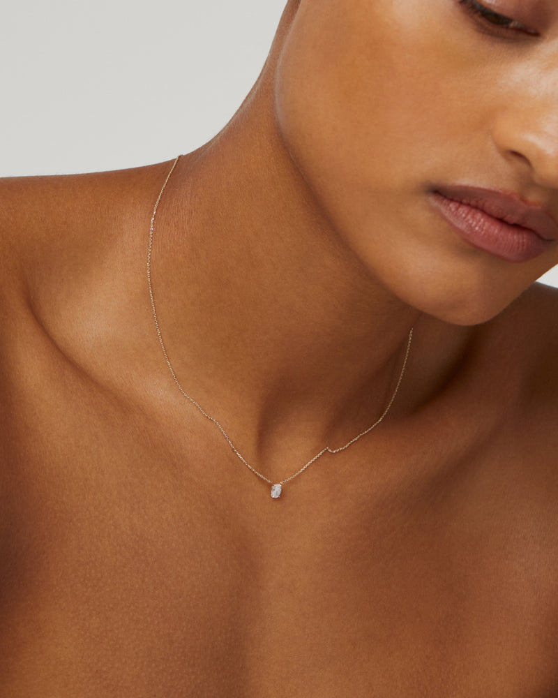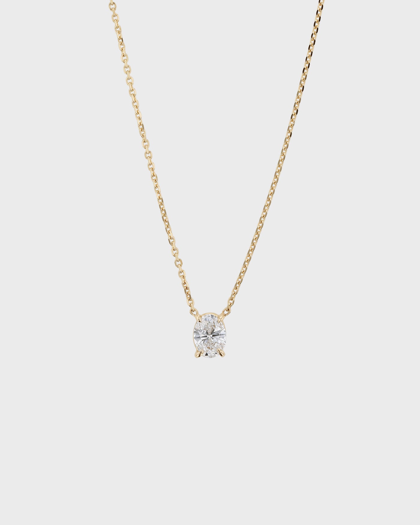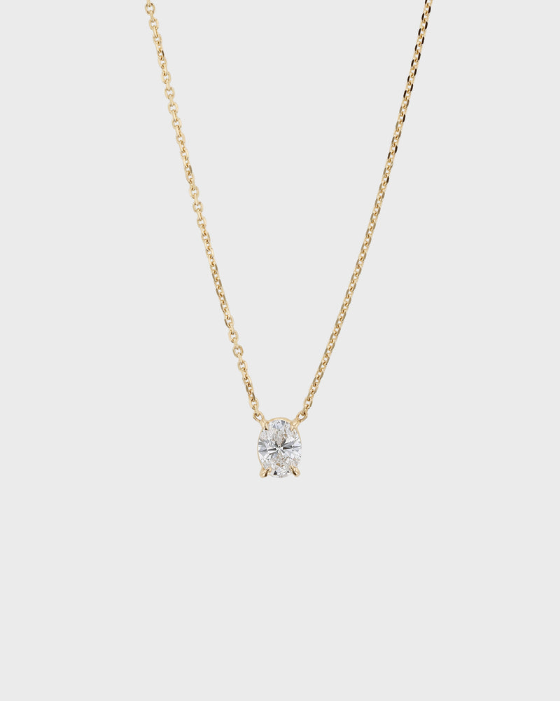 Our Solitaire Oval Diamond Necklace is strung with a dainty round cut diamond. Cast from solid 18-karat gold, it's suspended from our signature bold chain. A piece so delicate it gives the appearance of ‘floating’ on the neckline, let this piece speak quiet volumes on its own, or layer it with other fine necklaces from your collection.