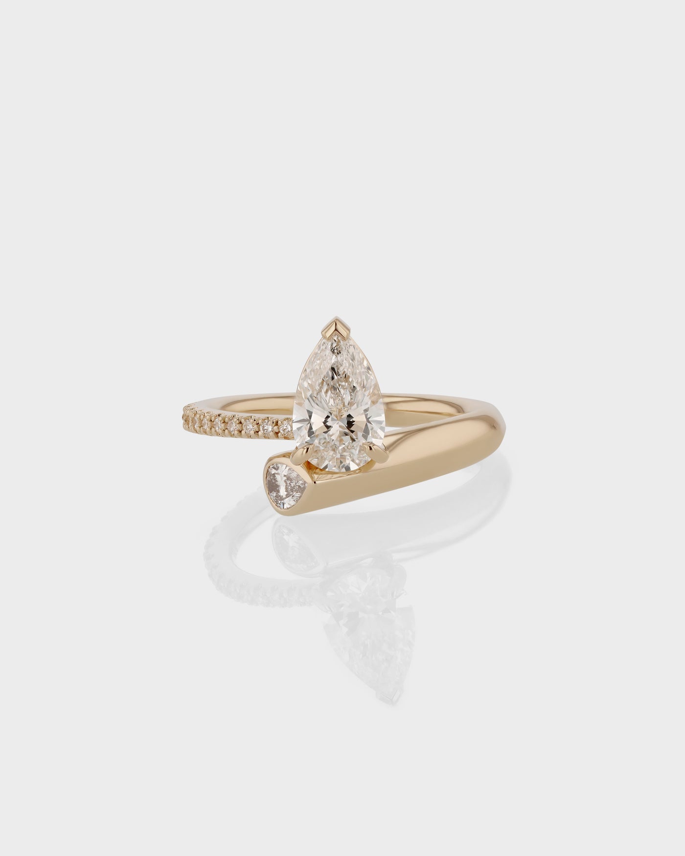 Championing a floating pear diamond, the Aria Pear Eternity Engagement Ring features a wrapped 18-karat yellow gold band that follows the shape and form of a matching pear accent diamond.