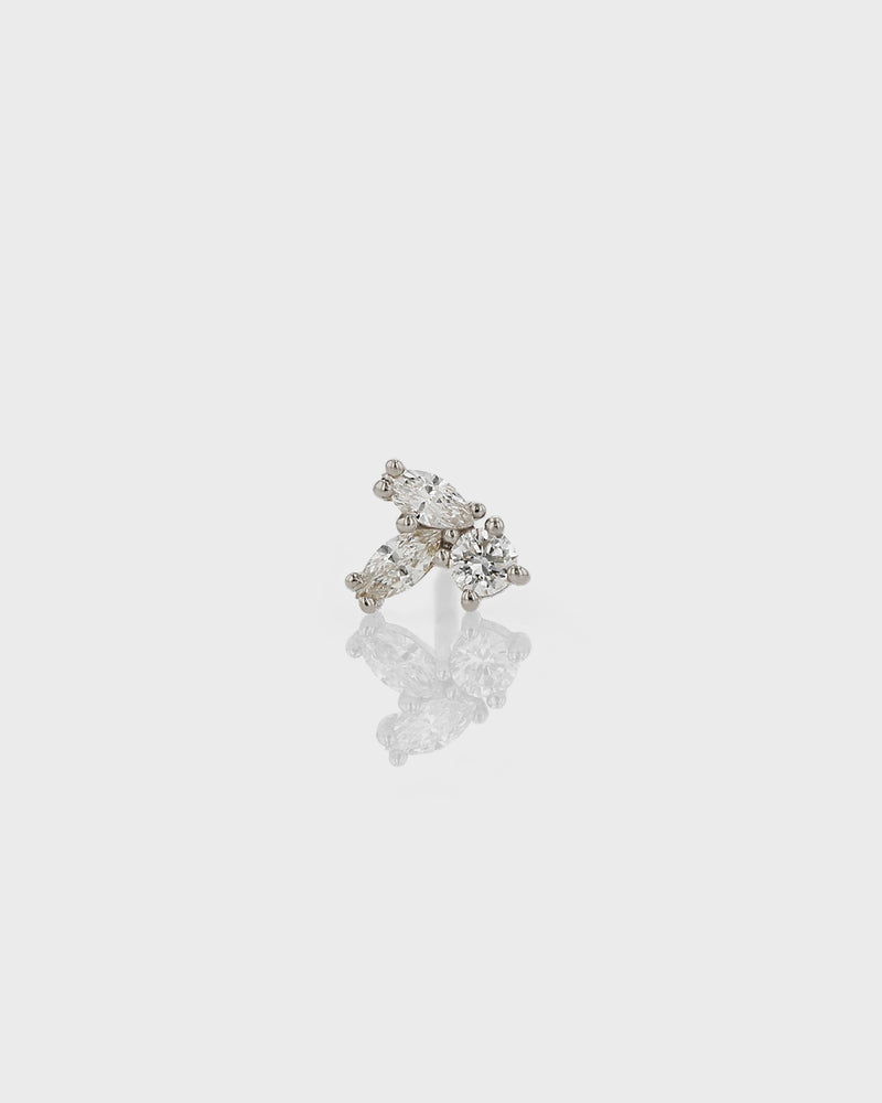 The Constellate Earring is a diamond-centric stud featuring an asymmetric cluster of claw-set marquise diamonds and a petite round diamond. Crafted in platinum, this piece is available to purchase as a single piece or a matching pair for healed piercings only.