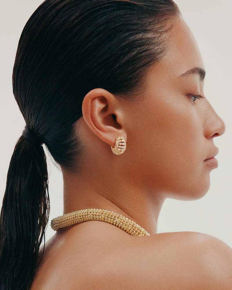 Crafted from 18 karat solid yellow gold that seemingly stretches into impossible forms, the Diamond Medusa Hoops are a monumental design. This voluminous pair captures the allure of sea jellies rising from the depths of the ocean – every curve holds the quiet tension of something both solid and translucent.