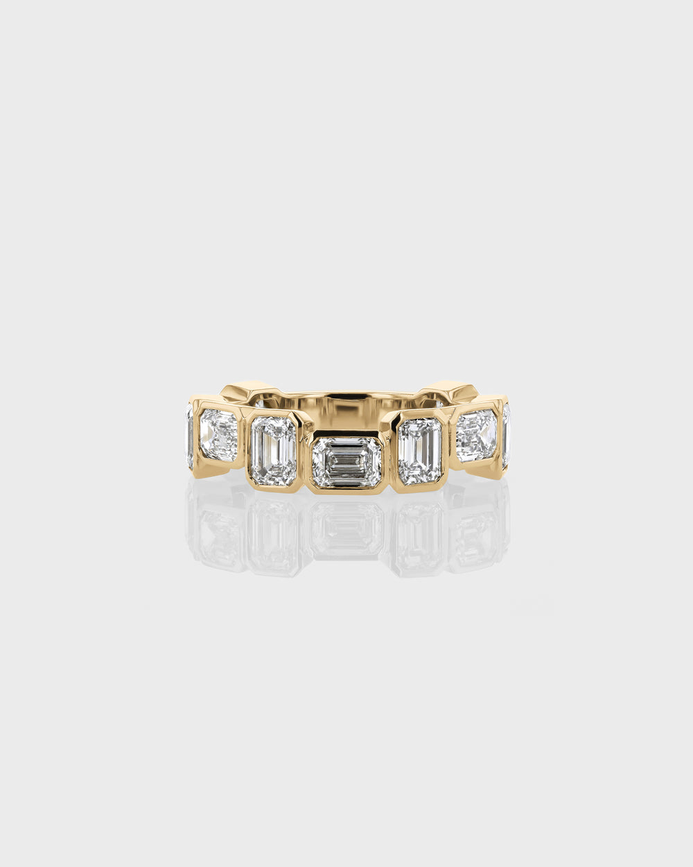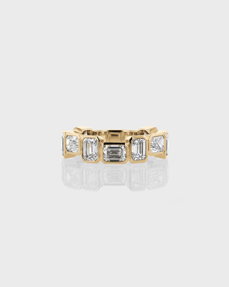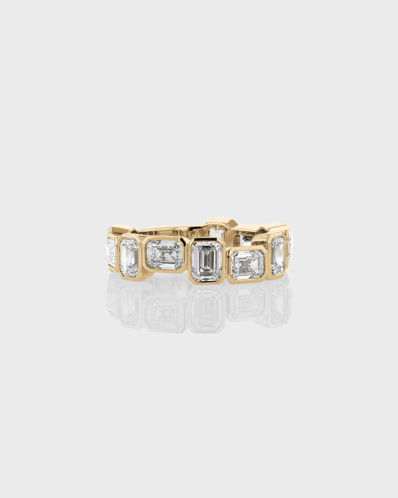 Drawing inspiration from sleek geometric tropes of the Art Deco era, the Emerald Deco Ring is an unconventional wedding band with a bold, playful sensibility. Championing 11 emerald-cut diamonds dancing at different heights and orientations, this standout ring is designed to pair with our signature Suspense or Solitaire engagement rings.