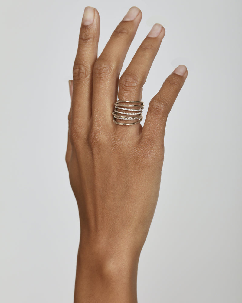 A bold statement ring that dazzles all on its own, our Entangled Diamond Ring is adorned with 107 melee white diamonds set in pavè. This intricate band is made using a single strand of wire, and was hand-formed by creative director Sarah Gittoes to evoke a fishing line, wrapped erratically to create a sculptural, overlapped form.