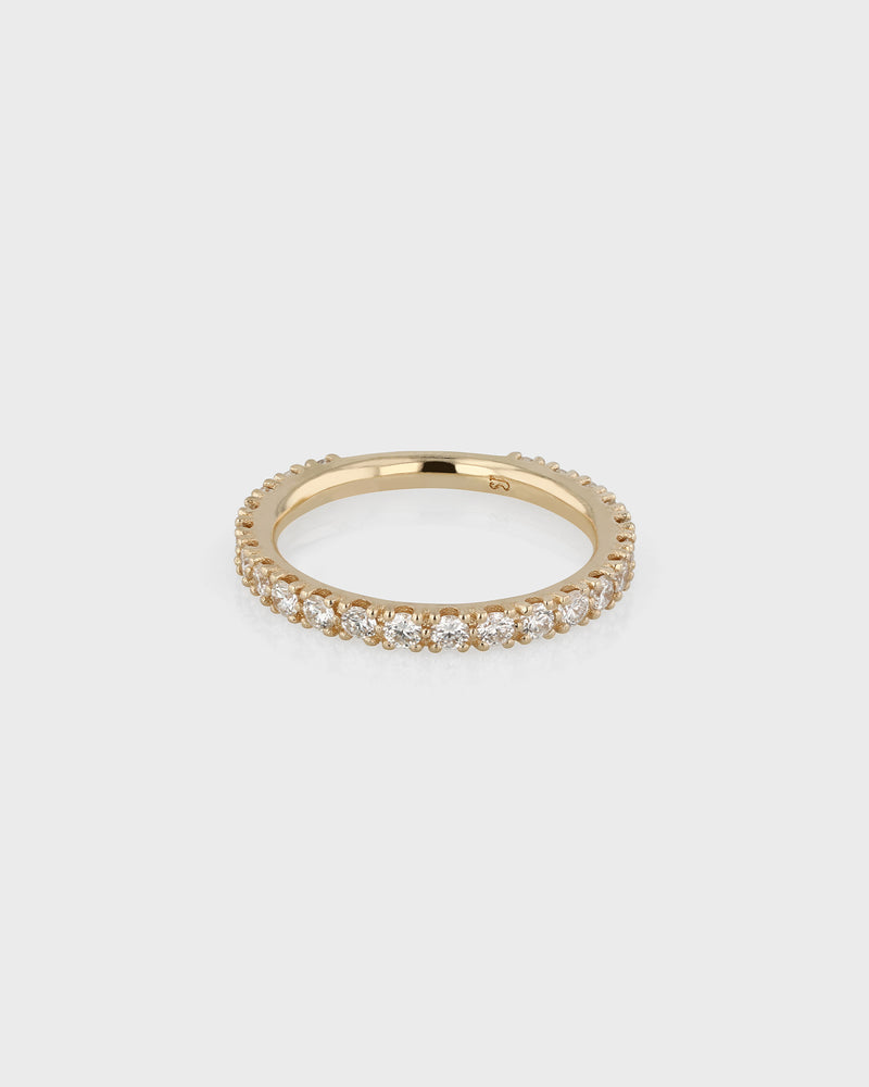The perfect addition to your engagement stack, our Eternity Diamond II Ring is available in 10-karat or 18-karat gold and features a delicate string of white diamonds claw set three quarters of the way around a 2.1mm band.