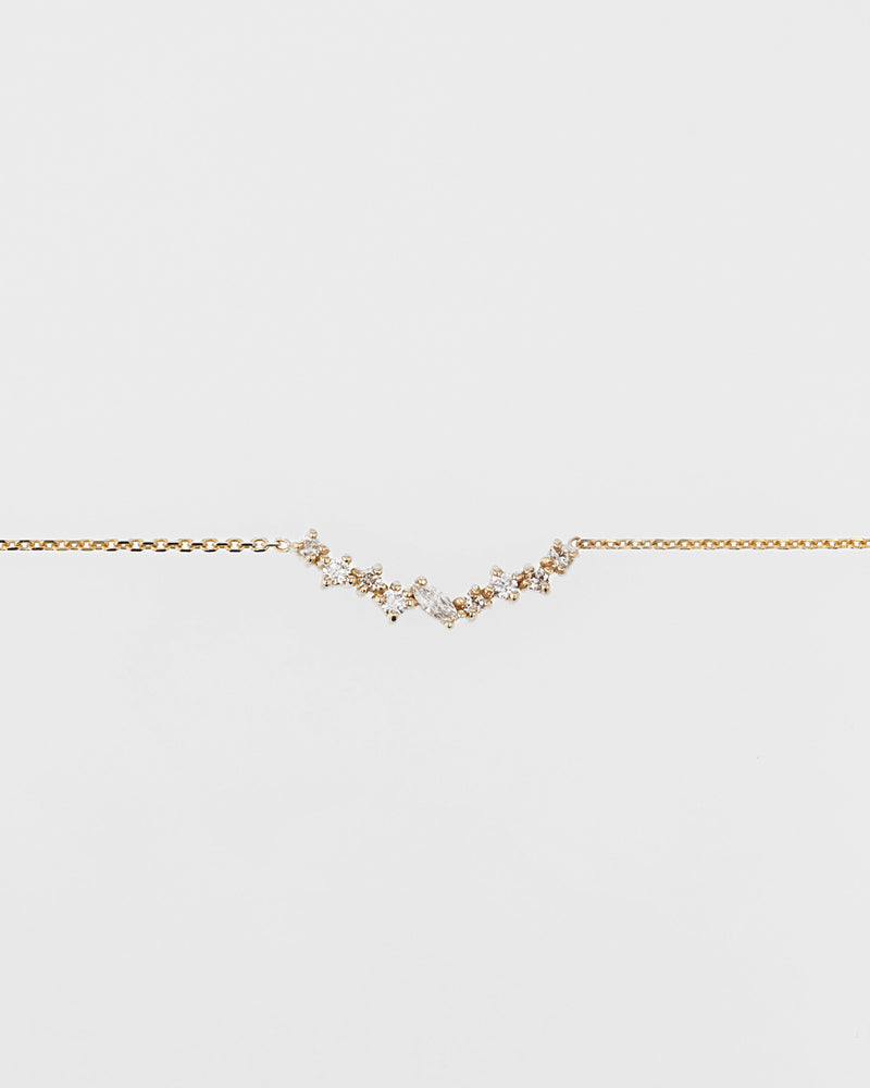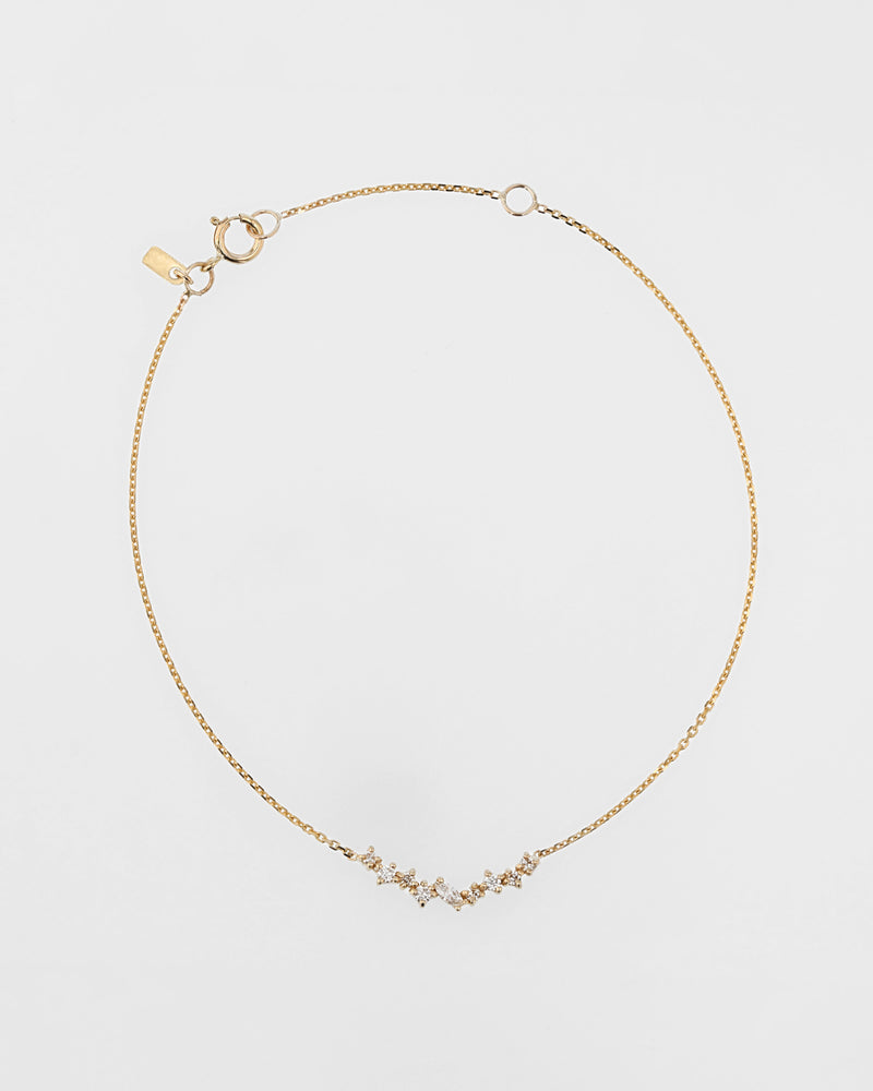 This bracelet features Sarah & Sebastian’s signature fine gold chain, which supports a light-catching pendant made of marquise and round diamonds. The organic clustered shape features nine white diamonds, and is cast in 14-karat white or yellow gold. The Gossamer Bracelet is dainty enough to layer with other bracelets, but really shines when worn solo.