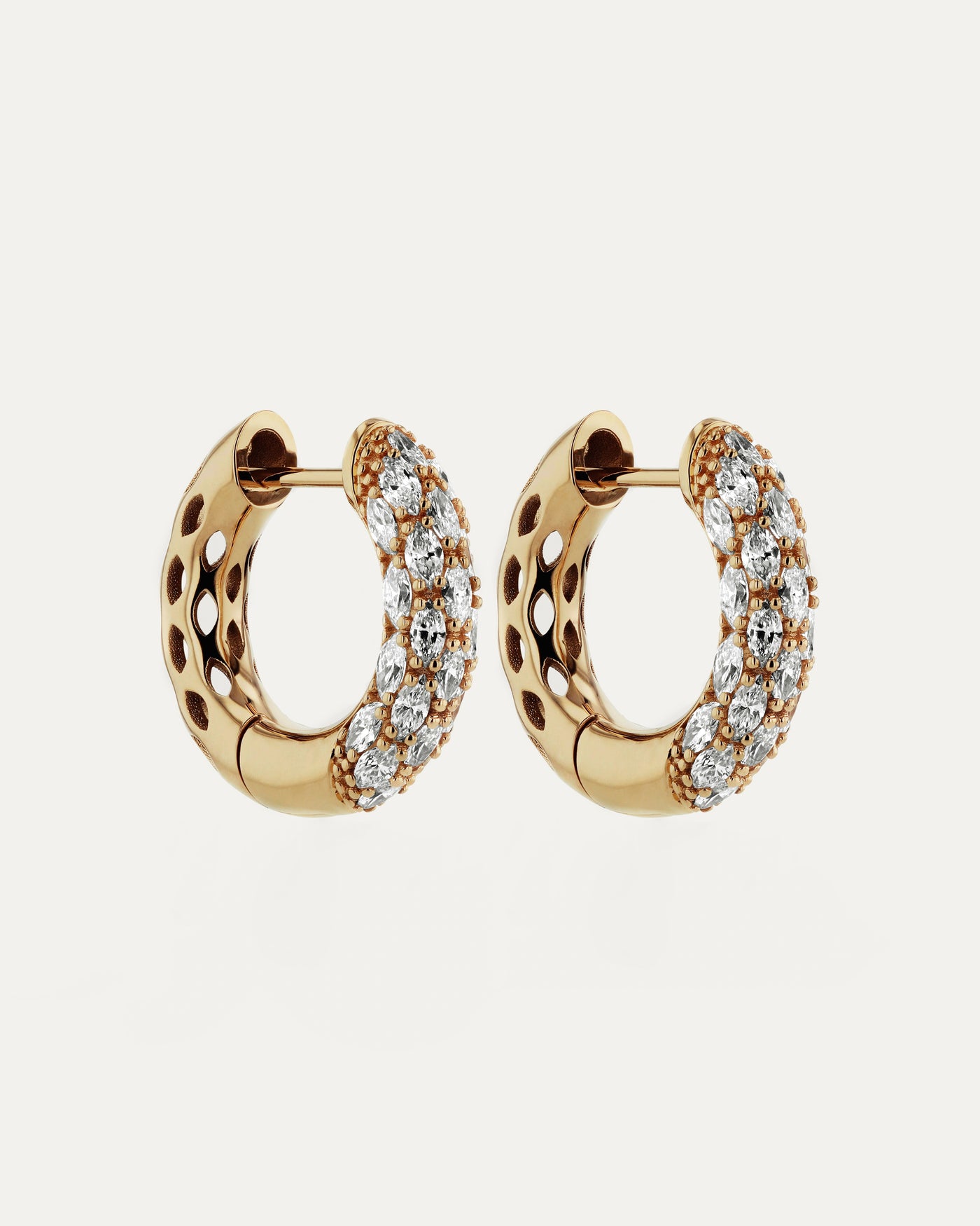 A chunky hoop uniquely encrusted with pavé marquise diamonds, the Marquise Tube Hoop is a bold and elevated statement earring. Refined in hollowed 18-karat yellow gold with marquise-shaped cut-outs across the back curve to mimic the front, this piece is designed to wear lightly and comfortably on the ear.