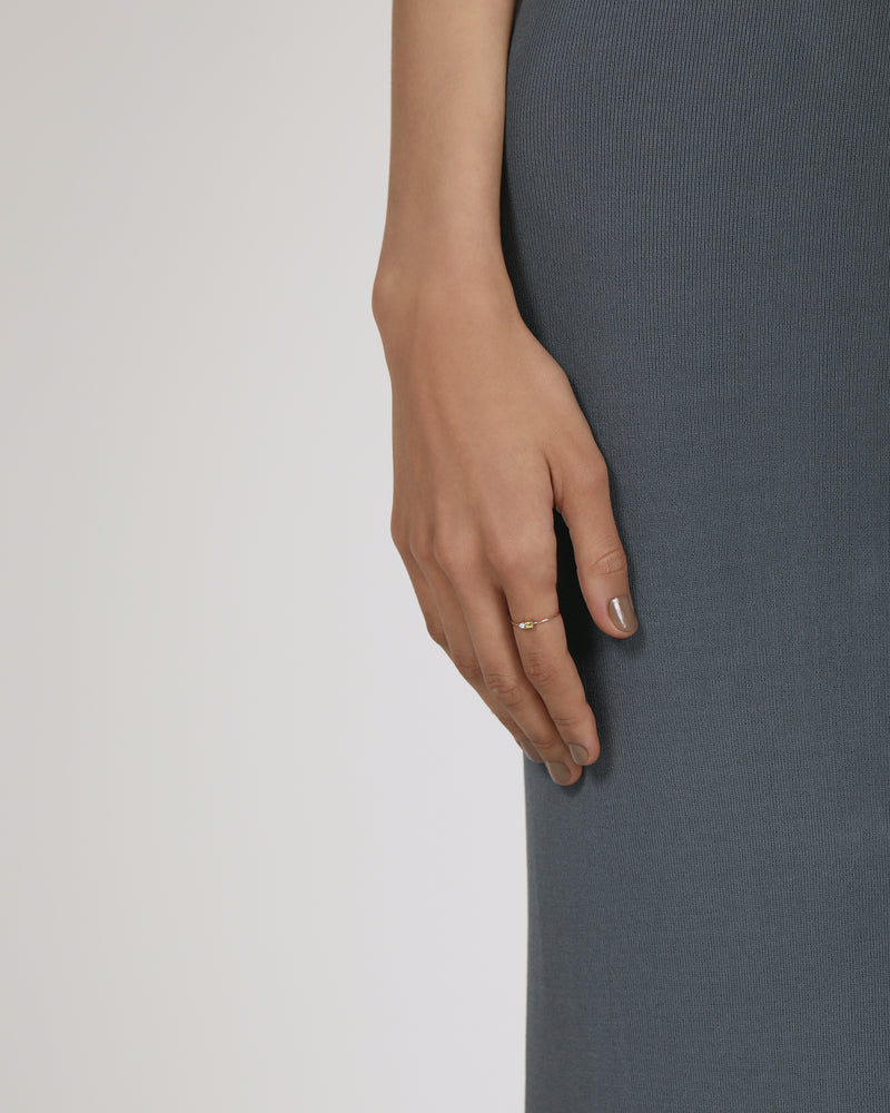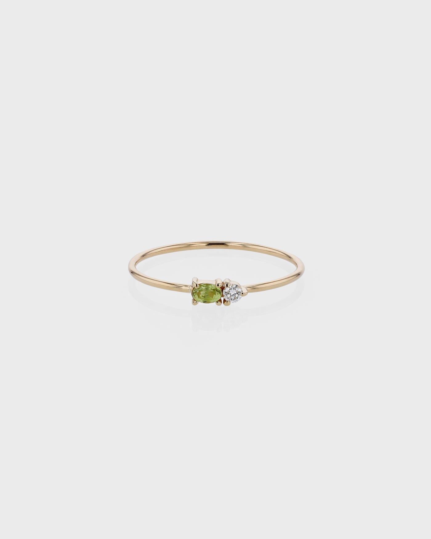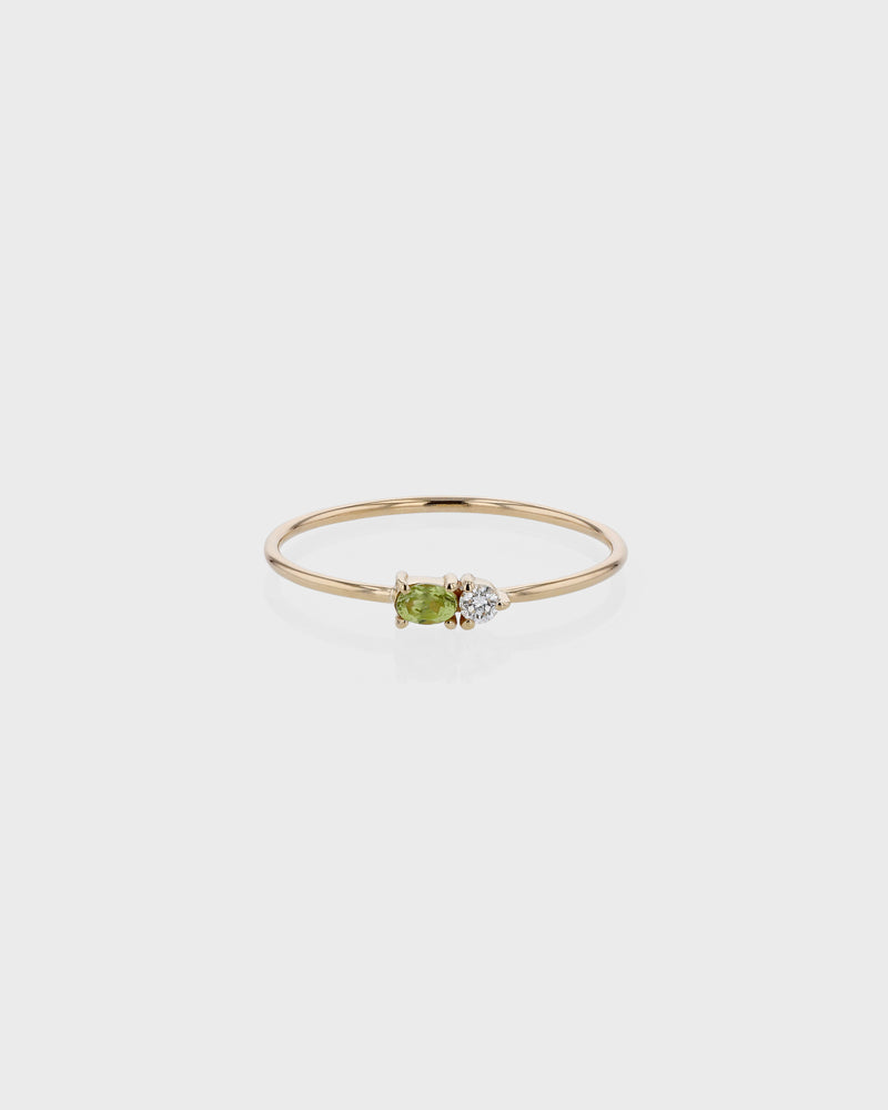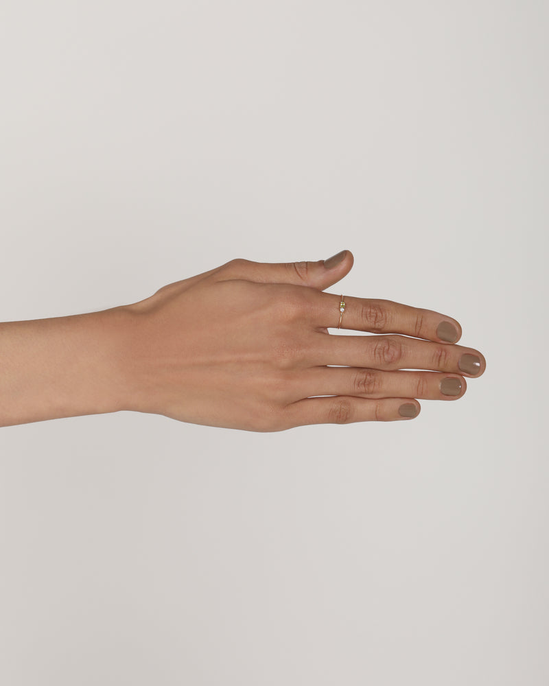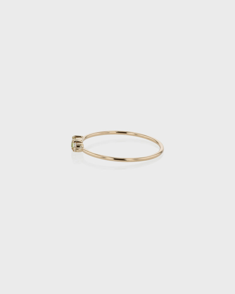 Handcrafted in 10-karat gold, the Micro Sand Diamond Ring was inspired by the unique beauty of sand at a microscopic scale. This fine wire ring features a dewy peridot cabochon illuminated with a single diamond.