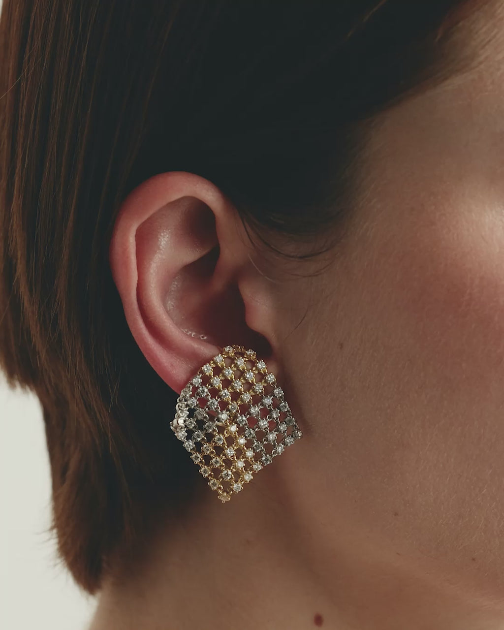 Handcrafted in our Sydney studio, the earrings combine 18k yellow gold and platinum in a fine mesh, set with 128 round white diamonds. Softly angular in form and finished with clip-on backings, they move with luminous fluidity, offering an enduring expression of radiance.