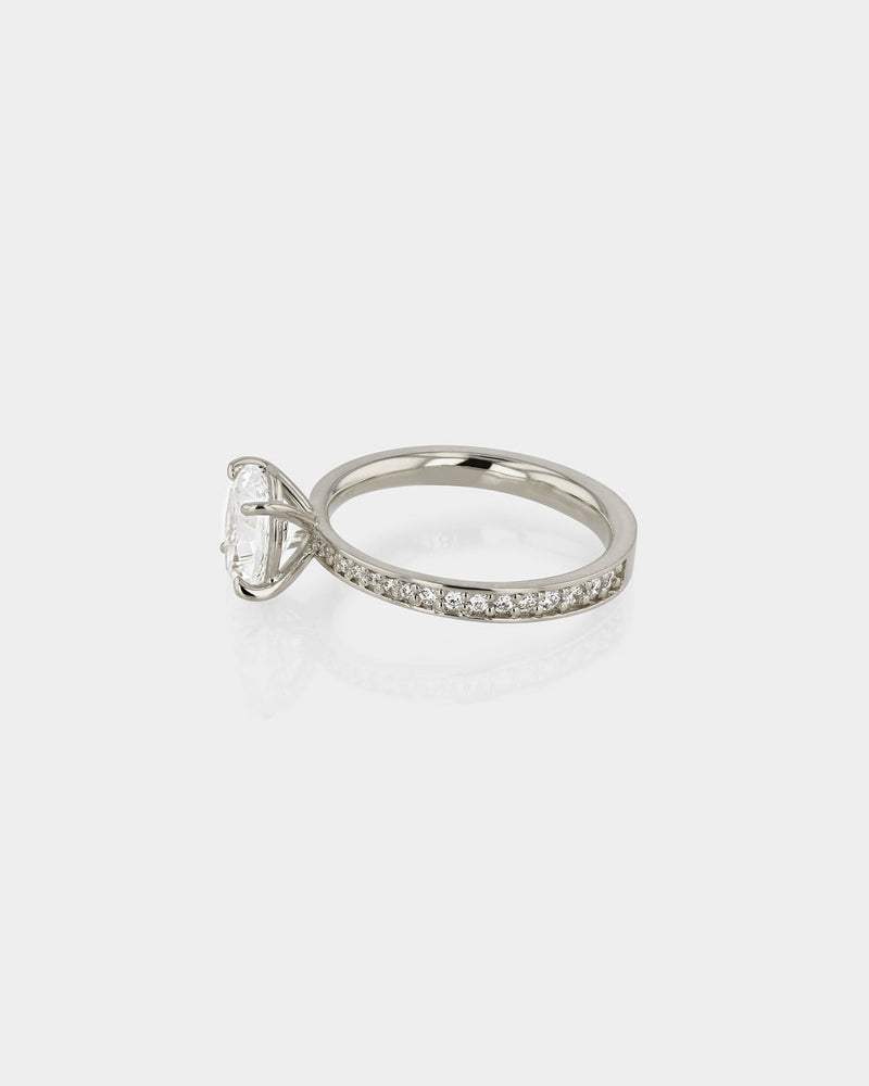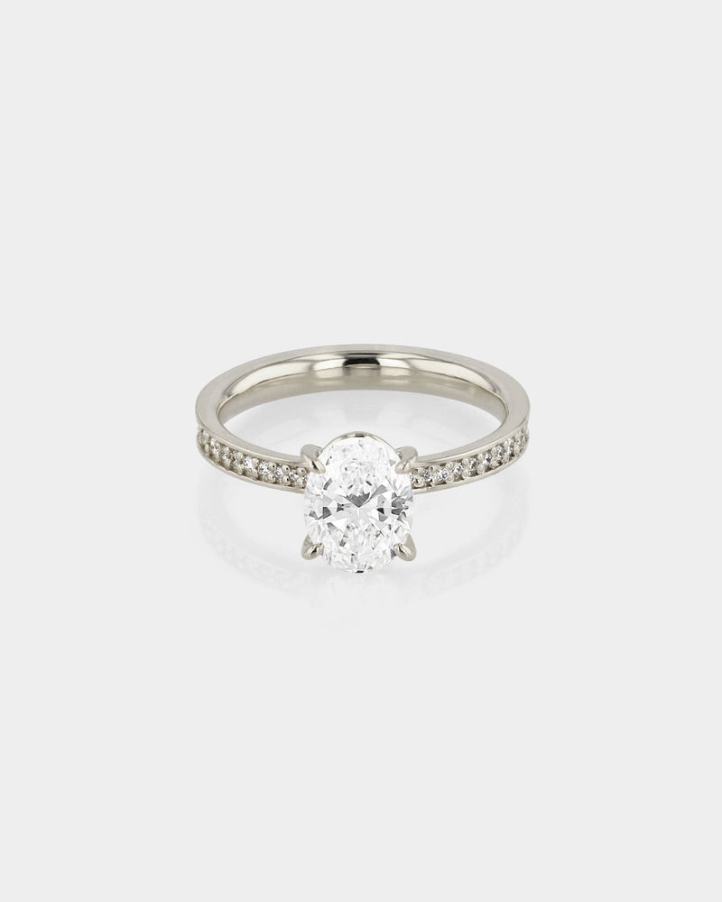 Experiment with design details that make up a SARAH & SEBASTIAN Engagement Ring. The Oval Channel Eternity Ring features an oval cut diamond on a claw set diamond band. All elements of this ring including band style, metal, carat and colour can be made bespoke as per your budget and request.