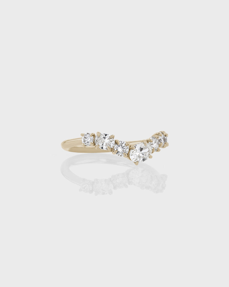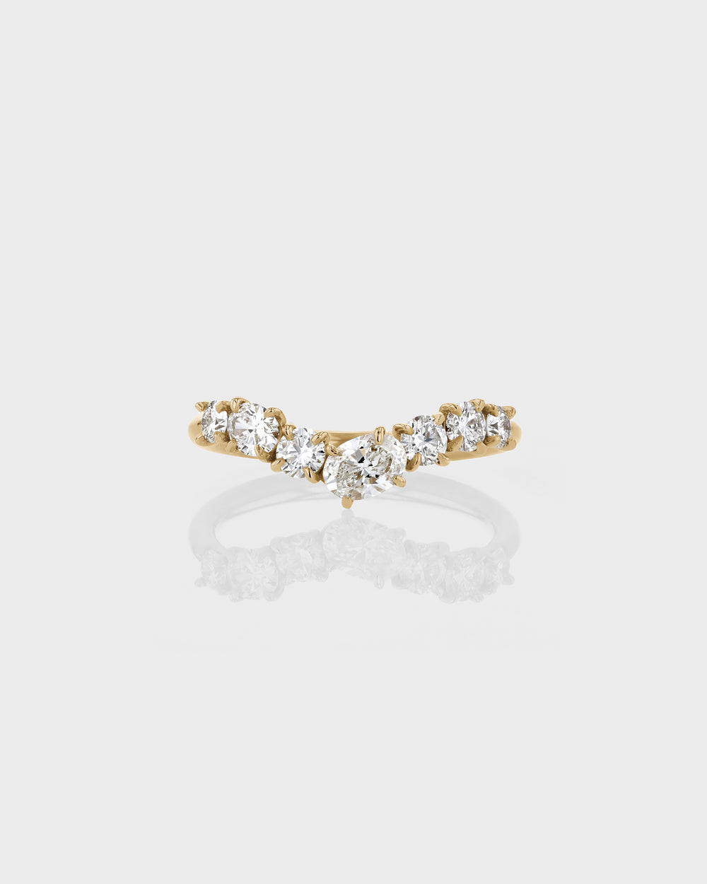 The Oval Salt Drop Ring is embellished with six round petite diamonds, anchored by a 5mm hero oval diamond. This statement wedding band is designed to dip to a point, creating a cove that fits effortlessly with a round, pear or marquise solitaire diamond engagement ring.