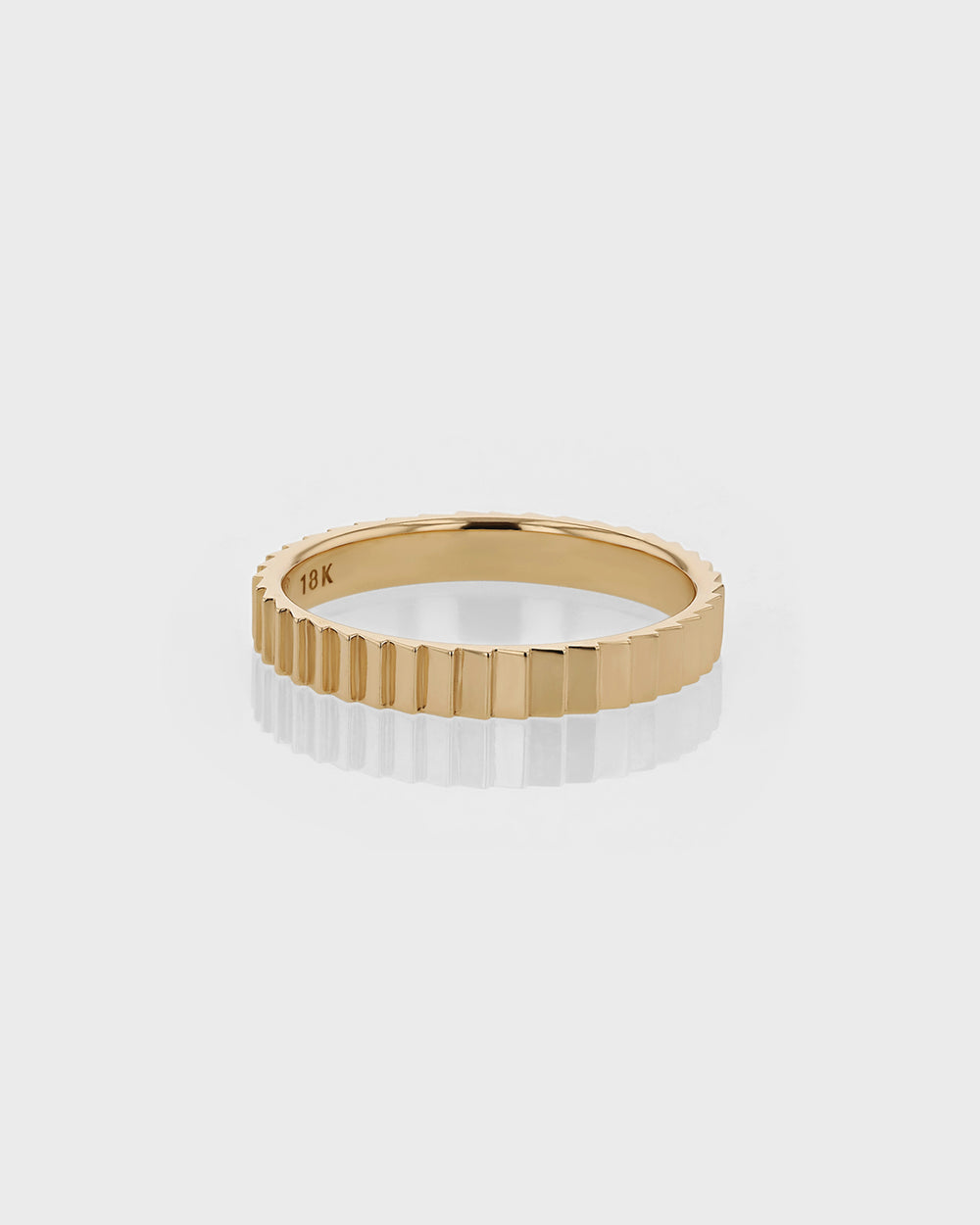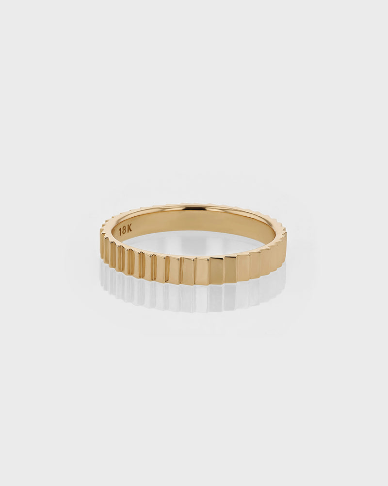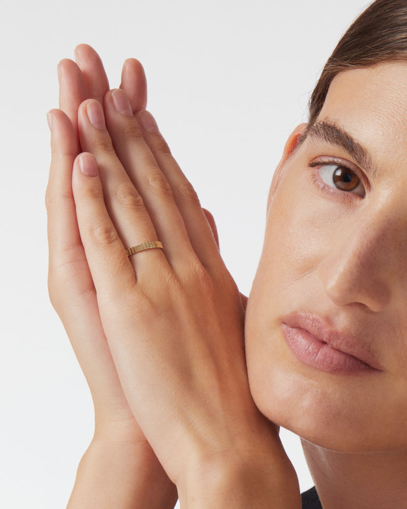 Featuring a repetitive scale pattern that gives off a kinetic illusion when exposed to light, the Scale Ring is a bold everyday piece to layer with other fine and embellished rings from the Sarah & Sebastian collection. Wear it with the Scale Cuff and Scale Hoops to complete a matching set.