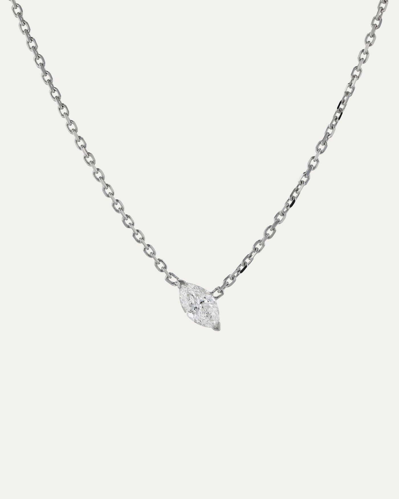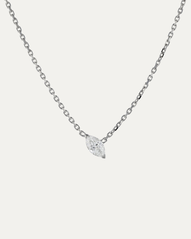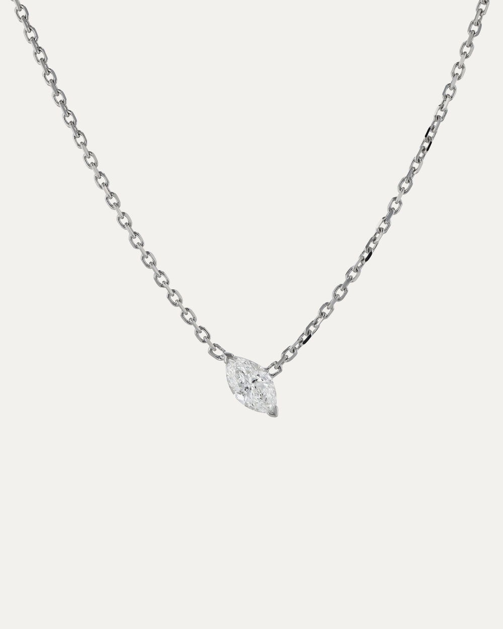 Our Solitaire Marquise Diamond Necklace is strung with a dainty round cut diamond. Cast from solid 18-karat gold, it's suspended from our signature bold chain. A piece so delicate it gives the appearance of ‘floating’ on the neckline, let this piece speak quiet volumes on its own, or layer it with other fine necklaces from your collection.