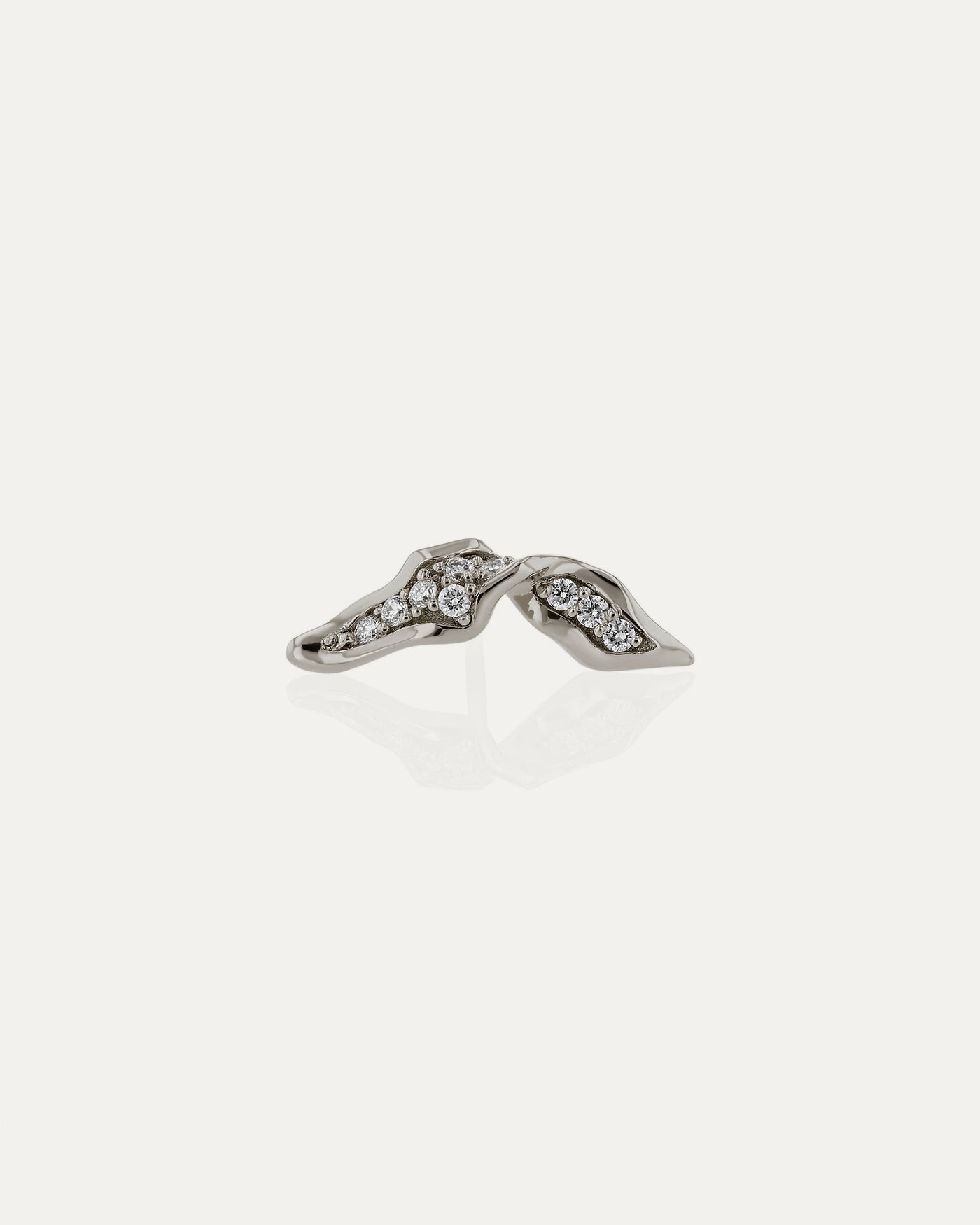 Inspirées par l'éclat des algues marines échouées sur le rivage, les boucles d'oreilles Perennial I sont une création organique sertie de diamants, conçue pour sublimer l'oreille d'une subtile touche de brillance. Réalisées en or blanc massif 18 carats, elles sont ornées de 3 diamants blancs ronds. Ce bijou est réservé aux piercings cicatrisés.