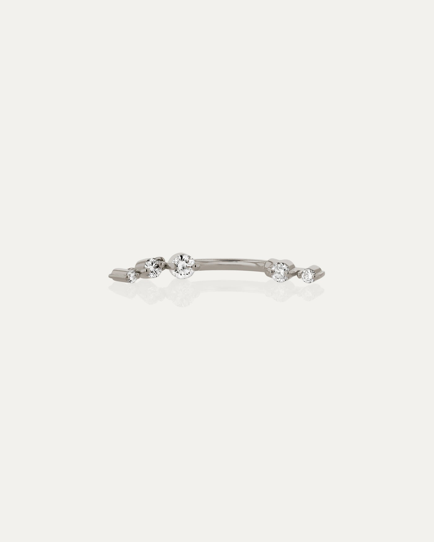 La boucle d'oreille Urchin Rook Threadless est un bijou raffiné en platine, orné de cinq petits diamants fixes. Dotée d'un système de tension et d'une barre incurvée, elle est spécialement conçue pour le piercing rook.