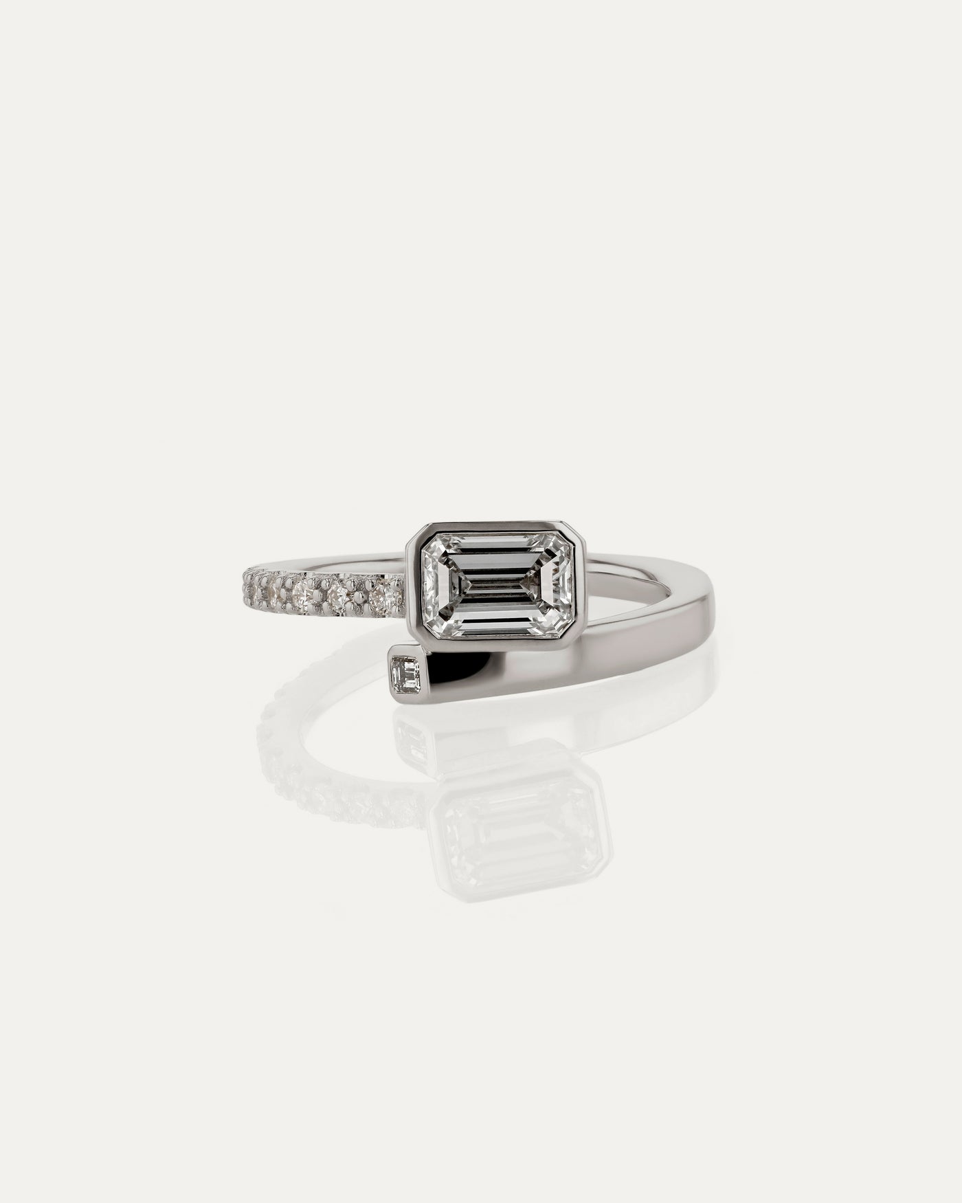 Championing a floating centre emerald cut diamond, the Aria Emerald Eternity Engagement Ring features a wrapped 18-karat white gold or platinum band that follows the shape and form of a matching emerald accent diamond.
