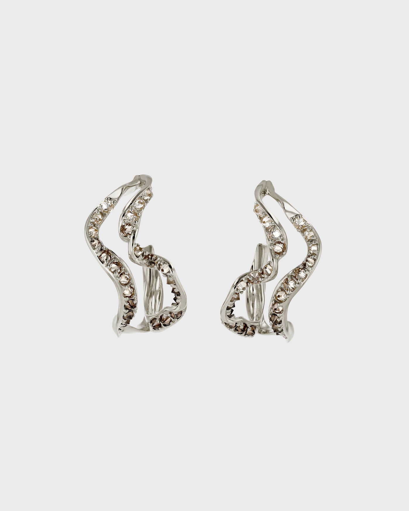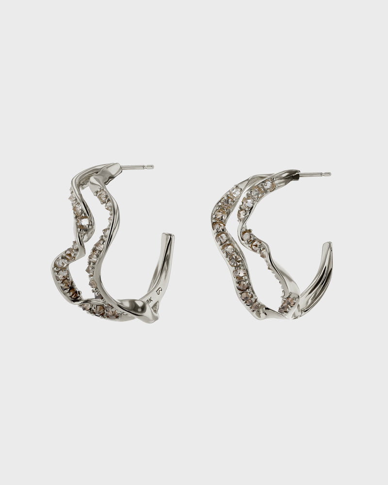 Championing gradients of white and champagne diamonds, uniquely inverted to mirror the myriad of golden shades found in Southern Australia's underwater kelp forests, the Golden Kelp Hoops are a statement set, handcrafted in 18-karat white gold. Creative and unique, featuring intertwining silhouettes that echo fluid kelp tendrils, they are the ultimate showstopping pair for cocktail parties and special occasions. Sold as a pair and suitable for healed lobe piercings only.