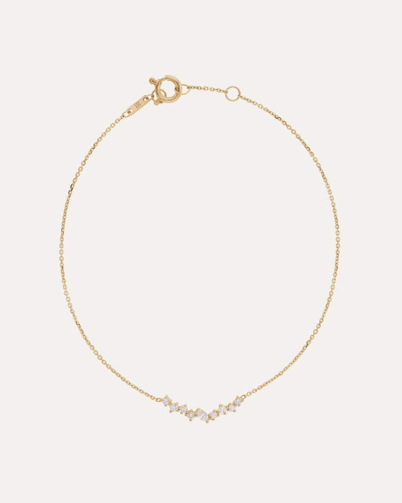 This bracelet features Sarah & Sebastian’s signature fine gold chain, which supports a light-catching pendant made of marquise and round diamonds. The organic clustered shape features nine white diamonds, and is cast in 14-karat white or yellow gold. The Gossamer Bracelet is dainty enough to layer with other bracelets, but really shines when worn solo.