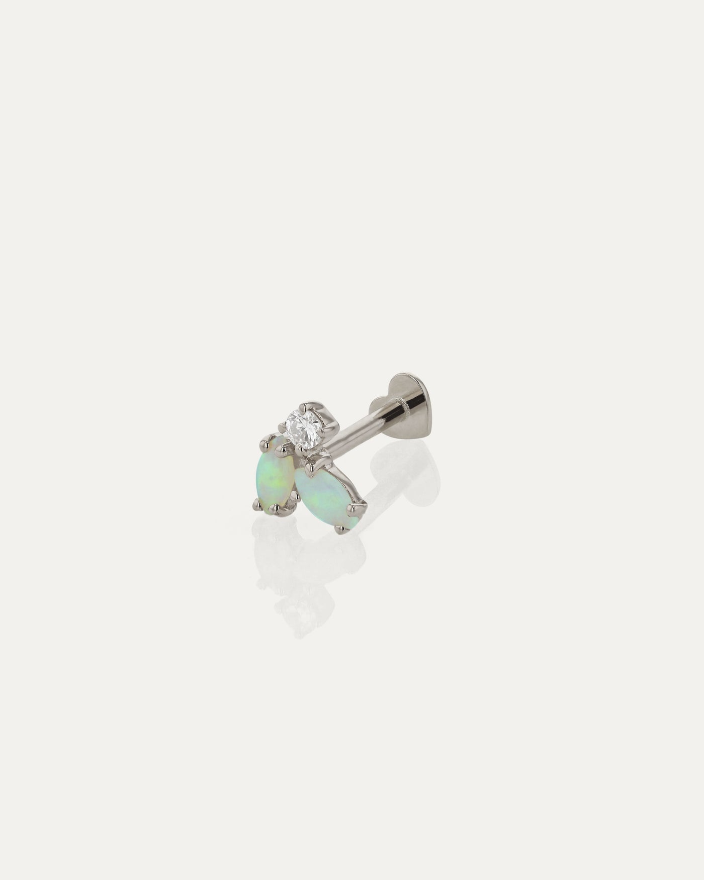 The Nymph Cartilage Earring is cast in platinum and features a striking wing cluster pendant, claw set with Australian marquise opal cabochons and a melee diamond. Our cartilage earrings can be worn in multiple areas of the ear, including the lobe, helix, conch, and daith. Note: As Opals are a naturally occurring stone they will differ from what is depicted online, with each being unique.