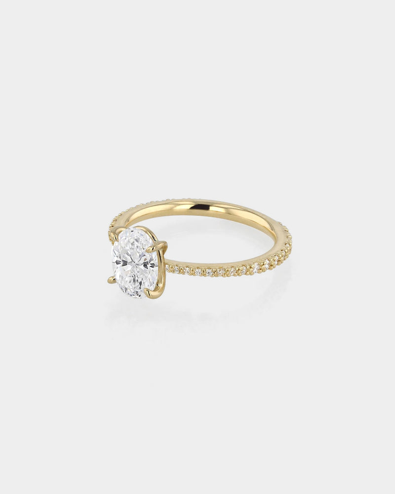 Experiment with design details that make up a SARAH & SEBASTIAN Engagement Ring. The Oval Eternity Engagement Ring features a oval cut diamond on a claw set diamond band. All elements of this ring including band style, metal, carat and colour can be made bespoke as per your budget and request.