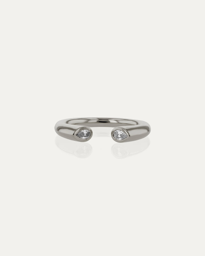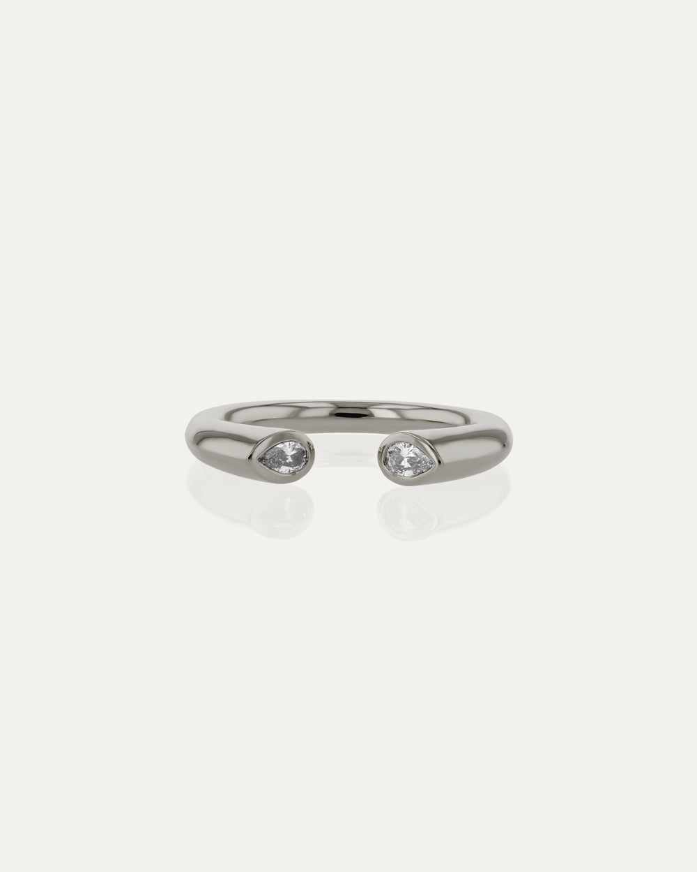 Celebrating Sarah & Sebastian’s refined design ethos, the Pear Suspense Duo Ring is a unique wedding band that embraces the tension between rigidity and fluidity. Distinguished by a split dual-ended design, it features a tapered band that trails the profile of two natural pear white diamonds. Crafted in 18-karat solid gold, this open-style wedding ring is designed to pair seamlessly with our Suspense and Solitaire Engagement ring collections.