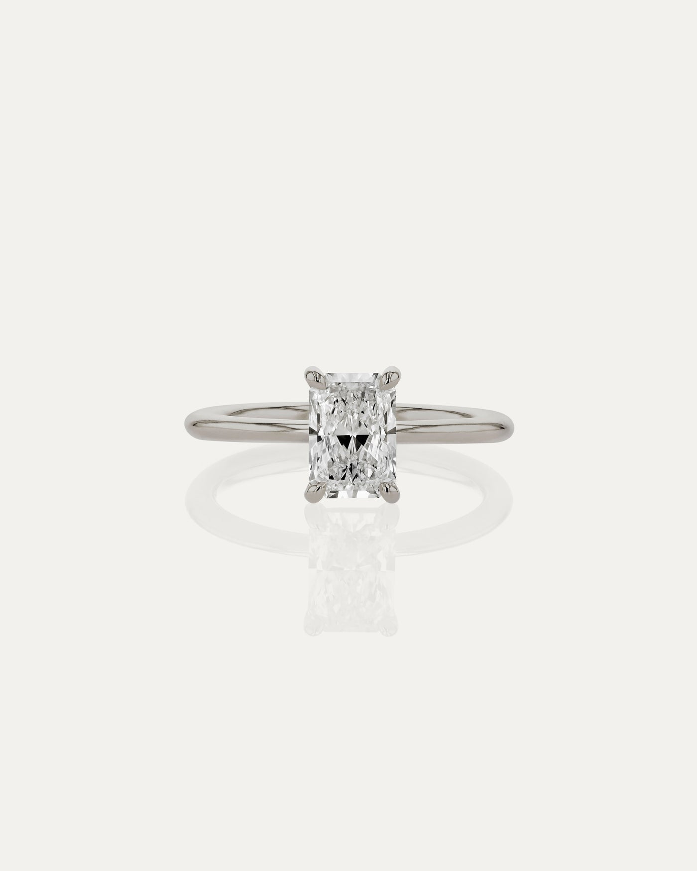 Experiment with design details that make up a SARAH & SEBASTIAN Engagement Ring. The Radiant Engagement Ring features a 4 claw radiant cut diamond on a signature round tapered band.