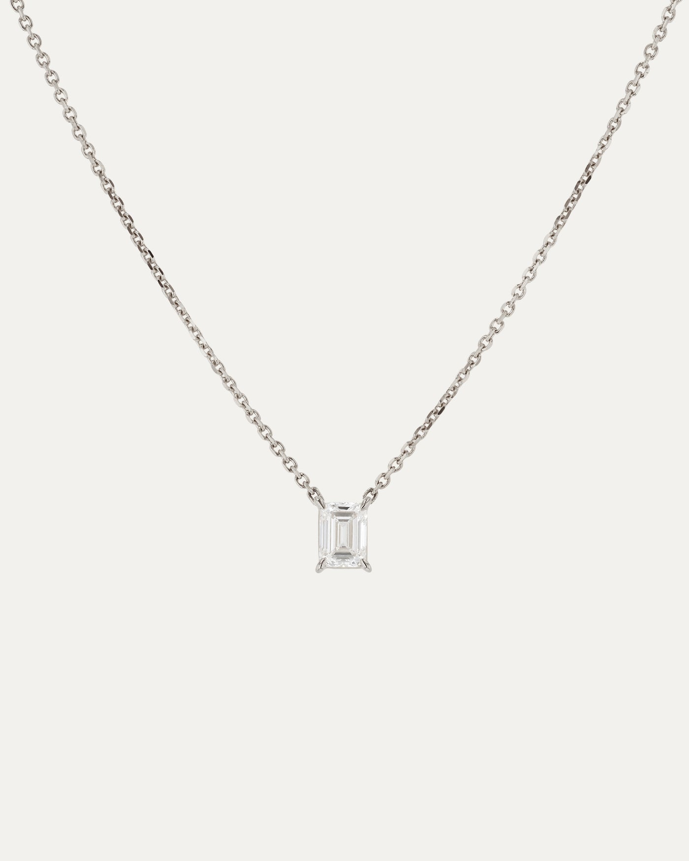 The Solitaire Emerald Diamond Necklace is crafted in solid 18 karat gold, showcasing a considered emerald-cut diamond suspended on our signature fine chain.