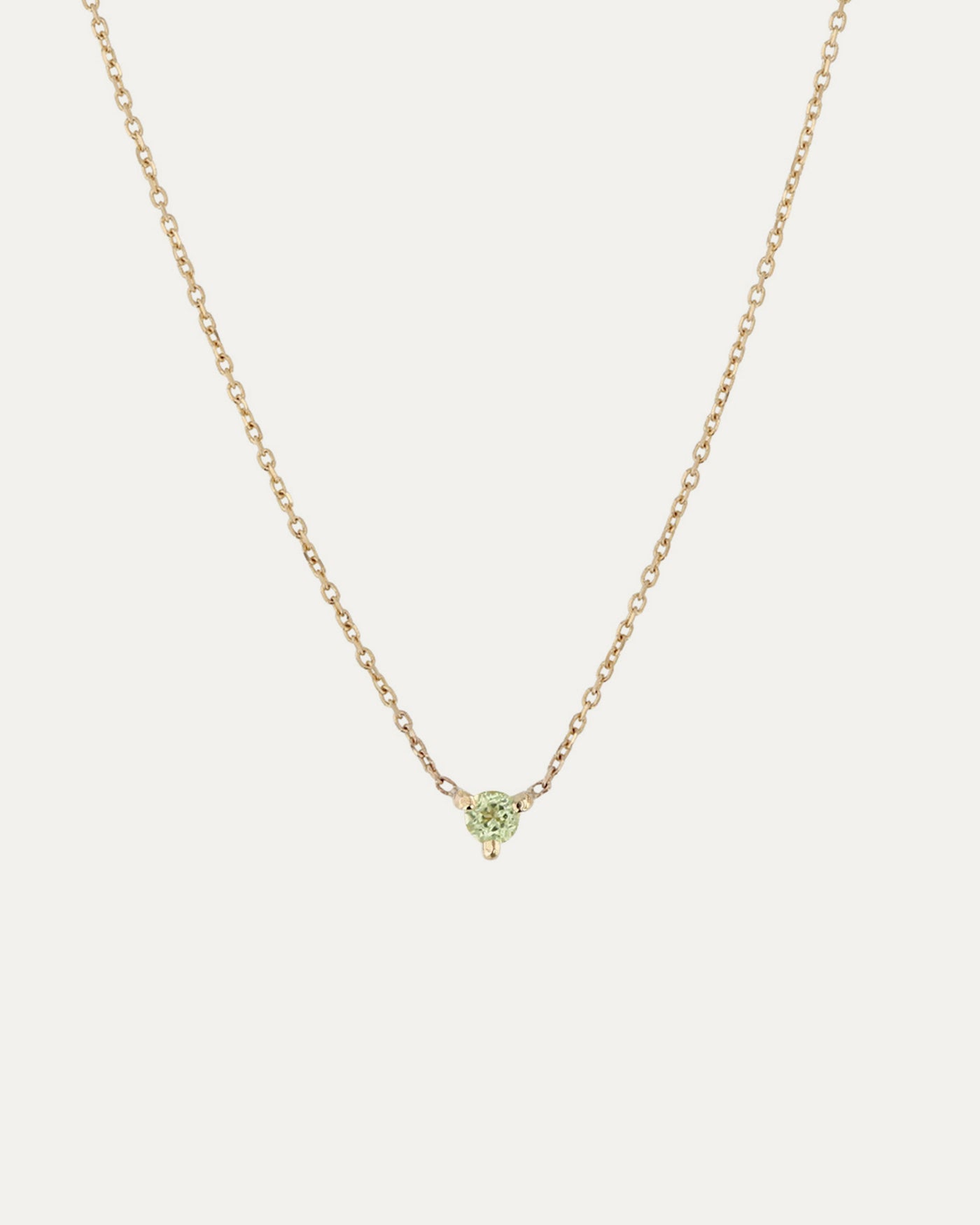 The Petite Peridot Birthstone Necklace is made in 14-karat gold and strung on our signature fine chain. Featuring precious gemstones corresponding to the month you were born. August's peridot has the symbolic meaning of wisdom & protection from evil.