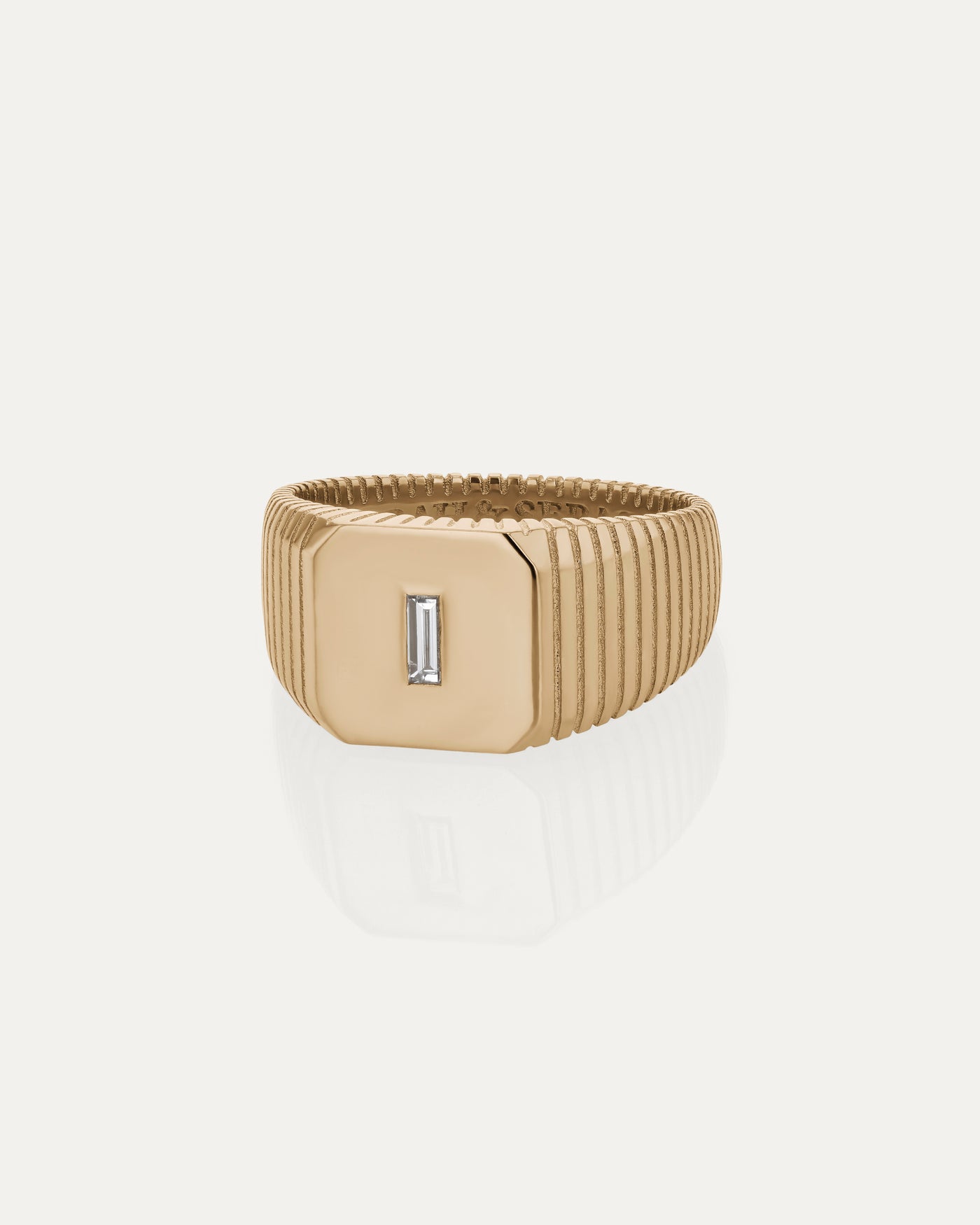 A textural take on a traditional men's signet ring, the Traction Diamond Signet Ring features a linear tire tread motif and a polished square face with Chamfered edges, elevated with a single baguette diamond. Offering a bold modern sensibility, this statement ring is a keepsake designed to stand the test of time.