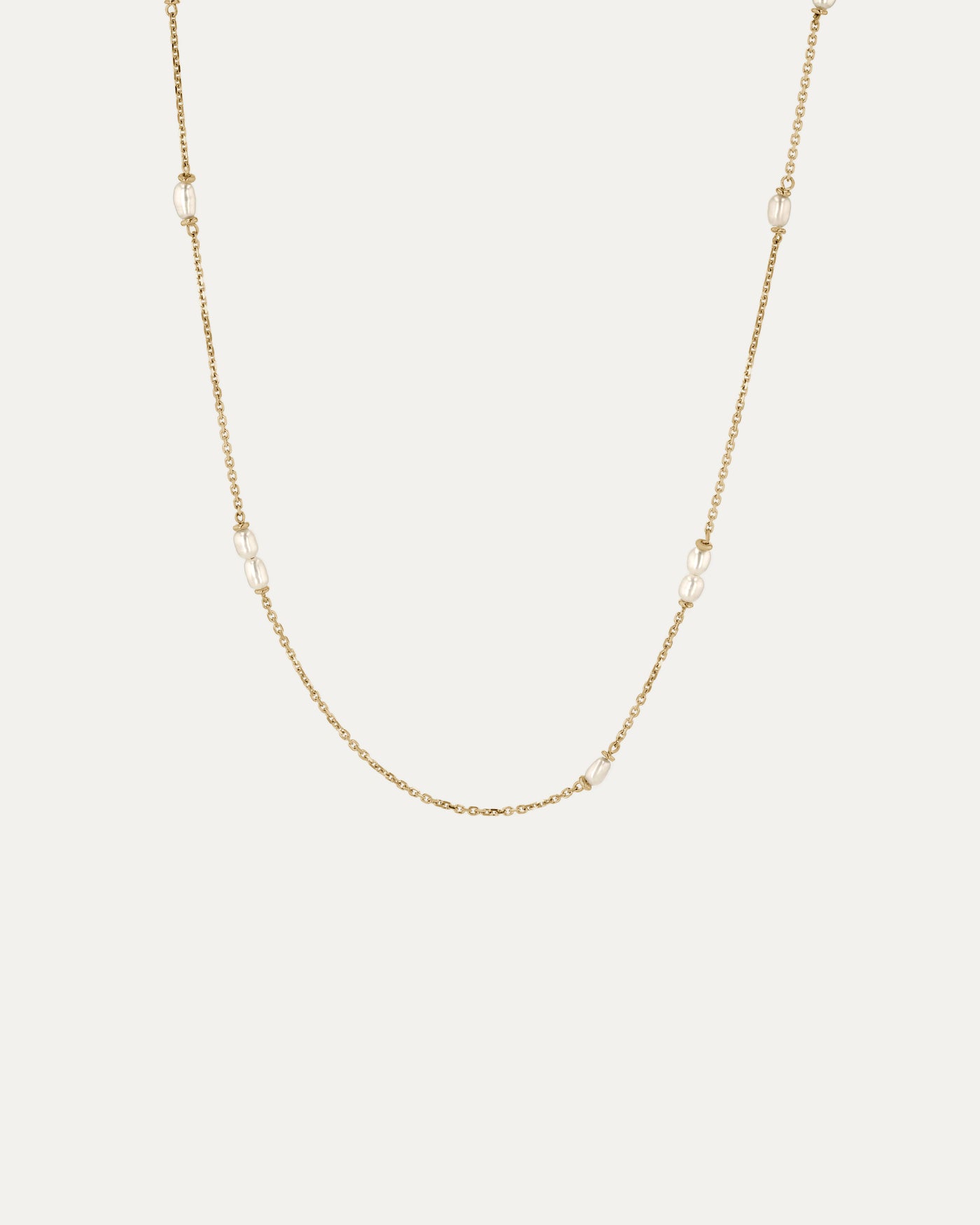 Featuring delicately imperfect natural seed pearls, intentionally dotted along our signature 18-karat solid gold chain, the Venus Pearl Chain is a refined layering necklace with an intricate sensibility that can be worn from day to night.