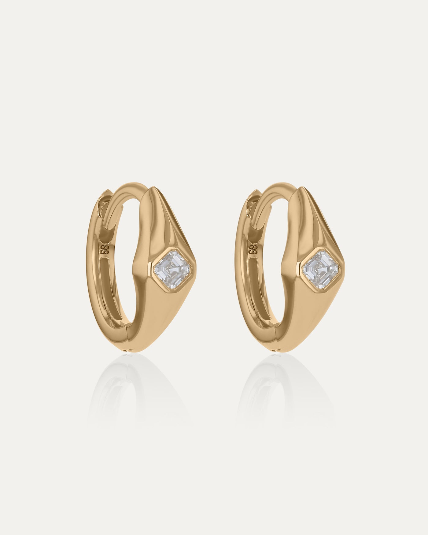 The Zenith Hoops are a refined SARAH & SEBASTIAN design - sleek and sculptural in 18k yellow gold, each set with a single Asscher-cut white diamond in a polished bezel setting. Handcrafted in our Sydney studio, they balance clean lines with radiant detail, creating a timeless expression of elegance.